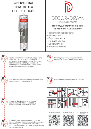 Для заказа рекомендуемого минимального количества Финишной шпатлевки Ft-1 ориентируйтесь на калькулятор стыковочного клея St-1/80мл и делите полученный результат на 2. Данное минимальное количество необходимо только для обработки самих изделий DECOR DIZAYN. В случае дополнительного назначения не для продукции DECOR DIZAYN требуется больше туб шпатлевки"